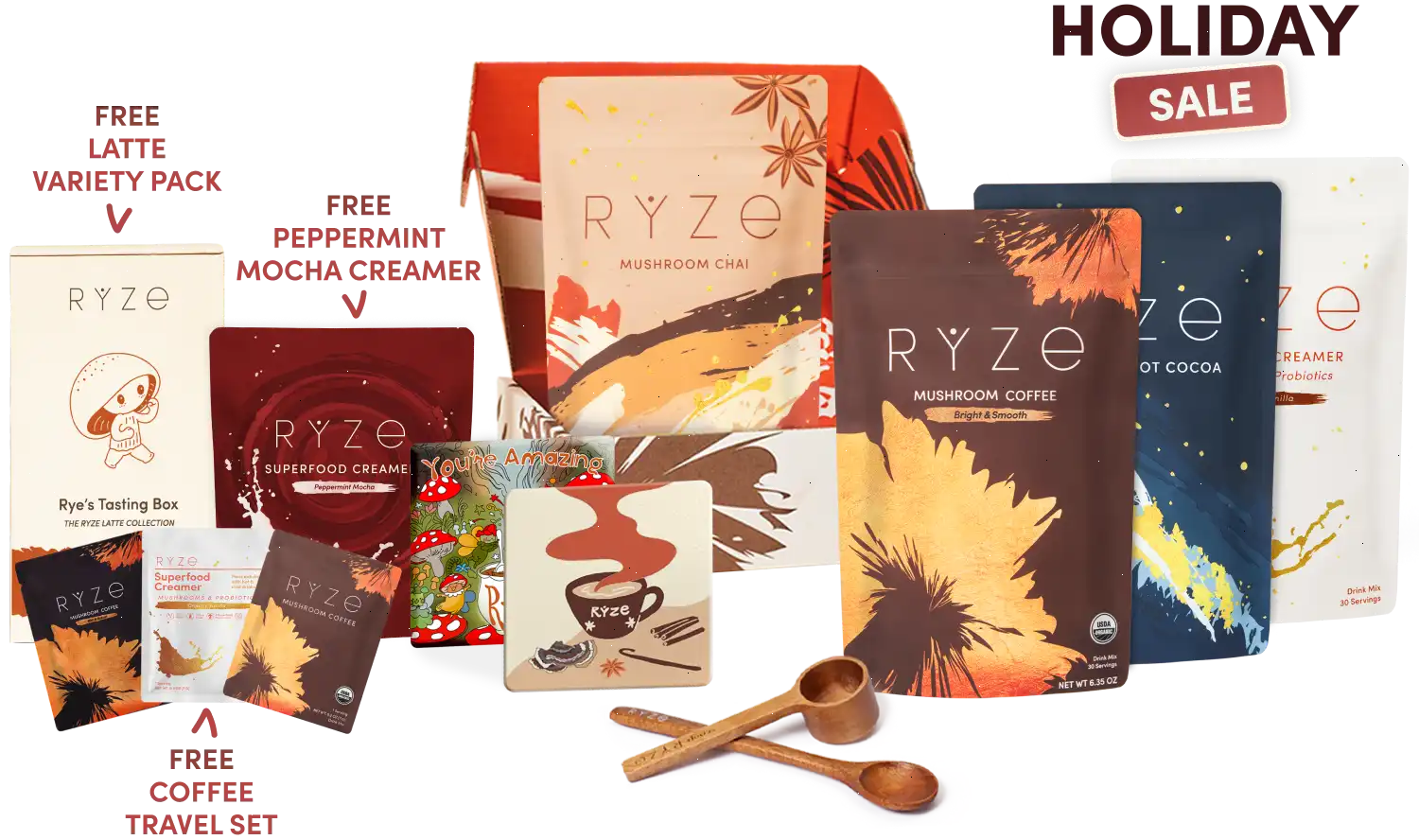 RYZE Mushroom Chai (20 Servings),RYZE Mushroom Coffee (30 Servings),RYZE Mushroom Hot Cocoa (20 Servings),FREE Superfood Creamer (30 Servings) on first order